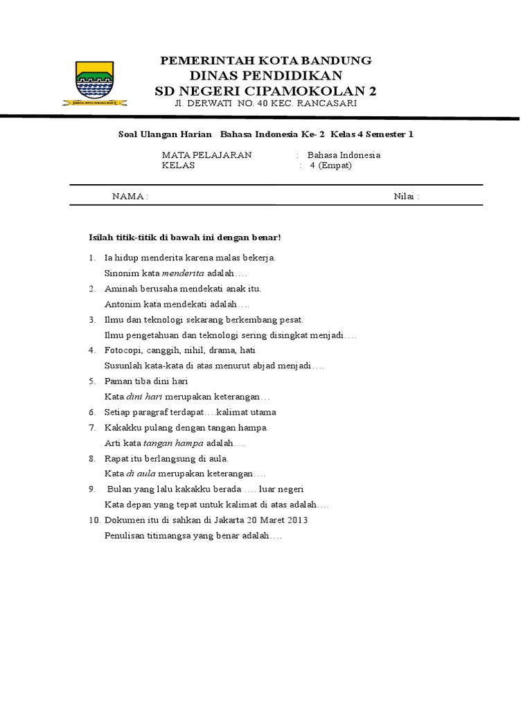 Soal Uts Bahasa Indonesia Kelas 4 Sd Semester 2